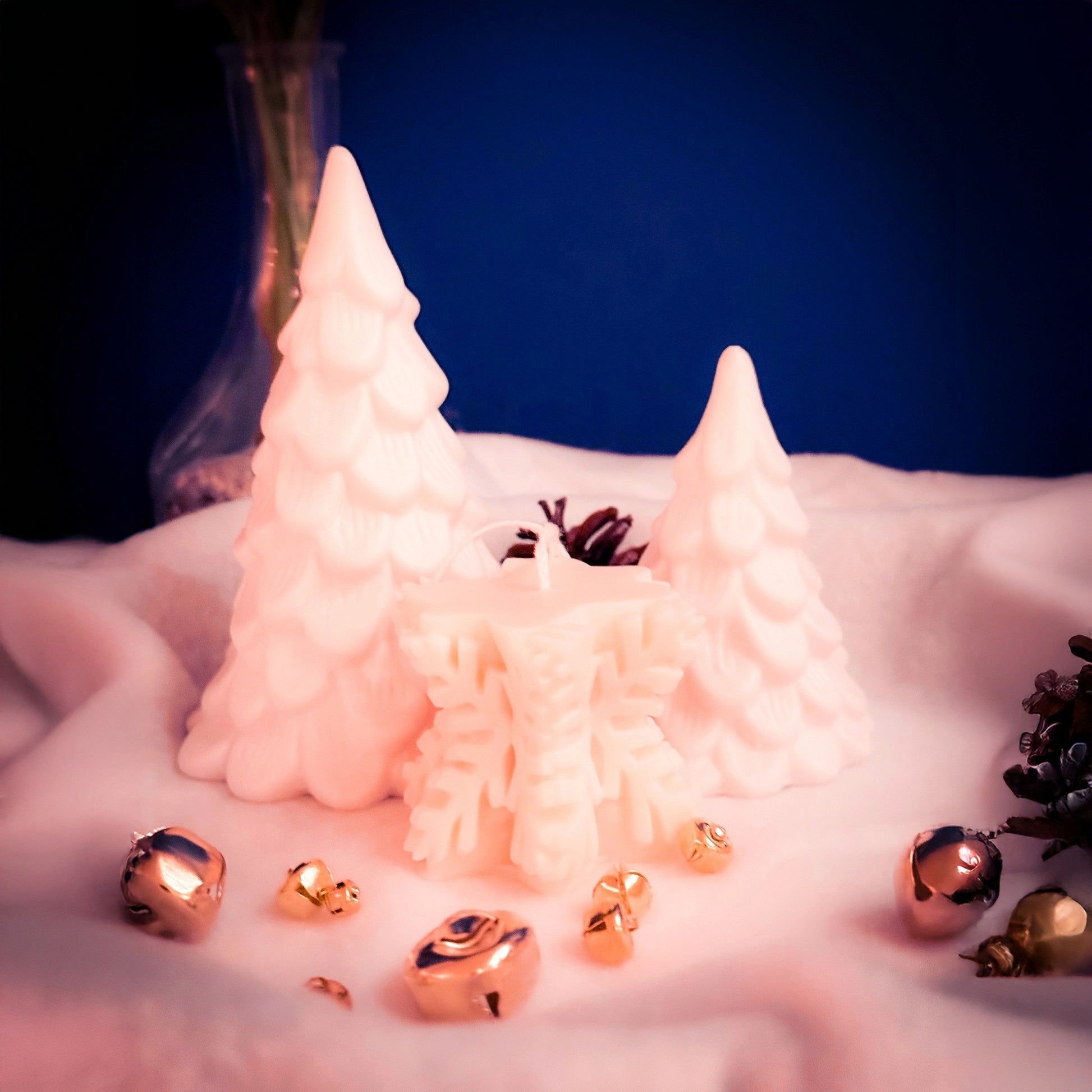 Et lite, dekorativt vinterlys med tydelig snøkrystallpreg.